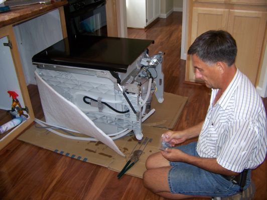 I started my day with a bit of weed whacking and Larry was finishing up valances on the window blinds, then it was back to unloading and putting stuff away. The stove and dishwasher arrived about 9. After we moved in the beds Larry worked on getting the stove converted to propane and installed, I unpacked boxes and then we moved in the couch...awkward heavy thing. By the time we got to the frig Larry was really sore and tired and as he moved towards the opening between the counters it was apparent that the handle/door would have to come off. We had planned to switch which way the door opened anyhow...but Larry hadn't planned on doing it in the middle of getting it in place. Then after getting the doors switched, which isn't really hard, just time consuming..he realized he left a bracket behind and then needed to remove the frig door again to get the bracket where it needed to be. He had finished when I took this picture...he was resting...ha ha ha! Aren't the floors lovely!!!!